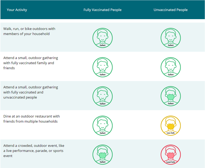 The CDC has released new mask guidance, removing their requirements for outdoor masking in certain situations. The new guidance states that it is safe for vaccinated people to walk run or bike, attend small gatherings and even dine outdoors without a mask. The guidelines have not changed for any indoor events or gatherings. New York State will not remove its mandate to wear a mask whenever social distancing is impossible, although Governor Cuomo did say that it was a step towards normalcy, and wearing a mask would not be necessary when running or biking outdoors away from others. The updated guidance from the CDC is outlined in the image below.